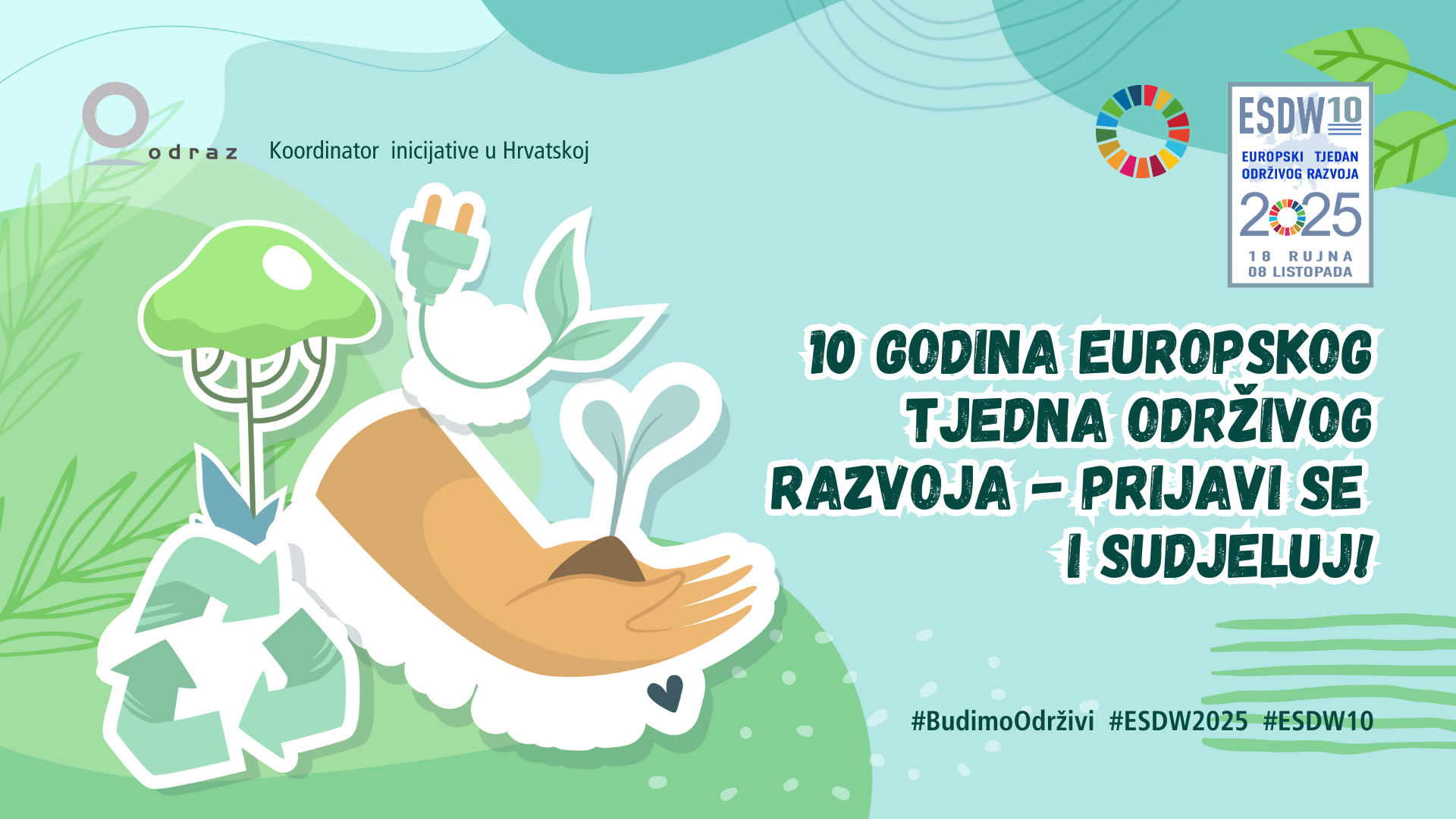 Europski tjedan održivog razvoja (ESDW) 2025. održat će se od 18. rujna do 8. listopada te će ove godine obilježiti svoju 10. obljetnicu. Ova inicijativa omogućuje organizacijama i pojedincima da predstave svoje aktivnosti usmjerene na održivi razvoj i pridonesu jačanju svijesti o važnosti provedbe ciljeva održivog razvoja. Sudjeluj i prijavi svoje aktivnosti već danas te postani dio ove europske inicijative. Promoviraj ciljeve održivog razvoja u svojoj školi, na fakultetu, u udruzi ili poduzeću, u kvartu i lokalnoj zajednici!
